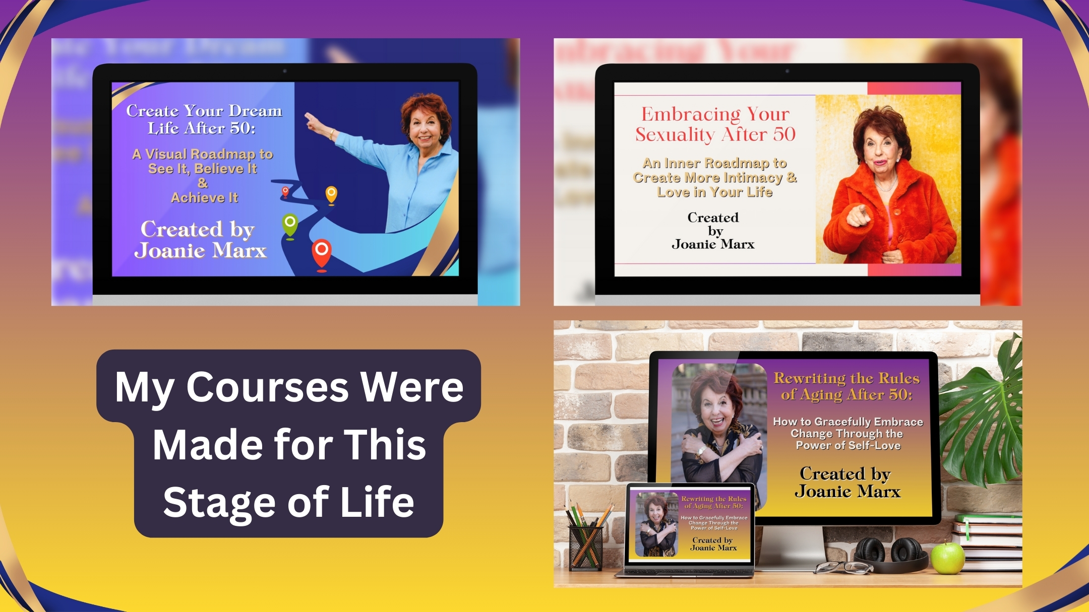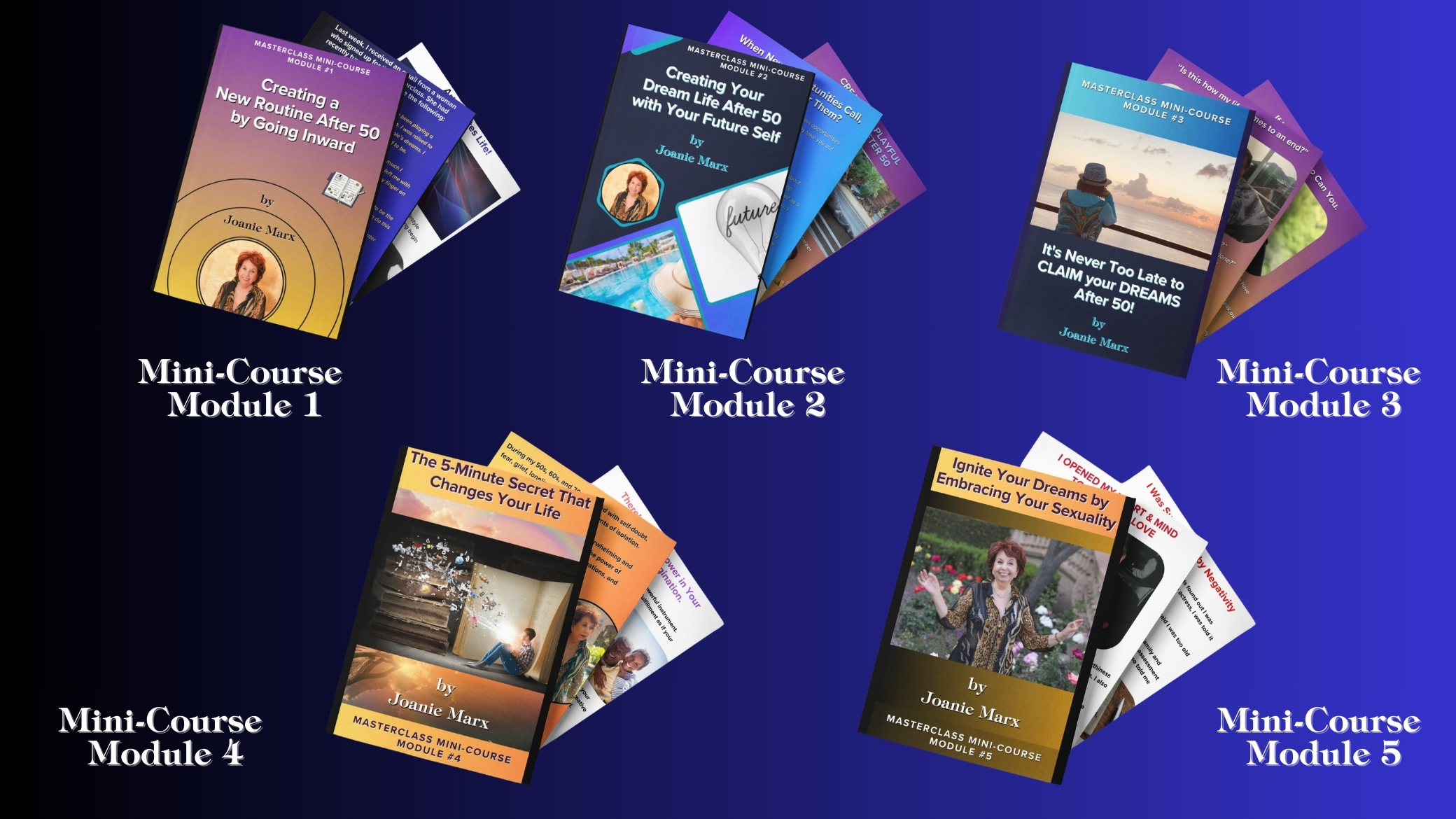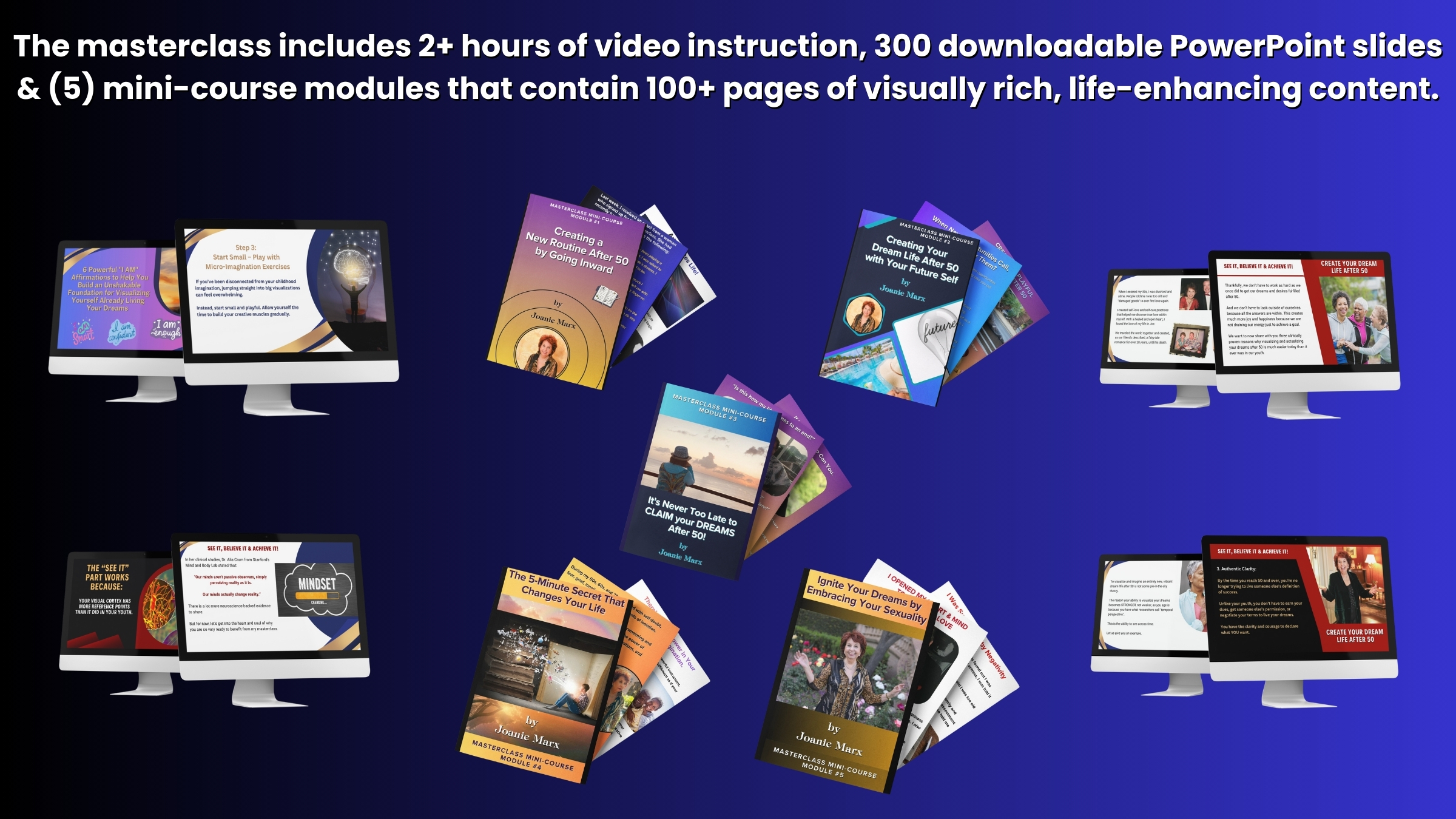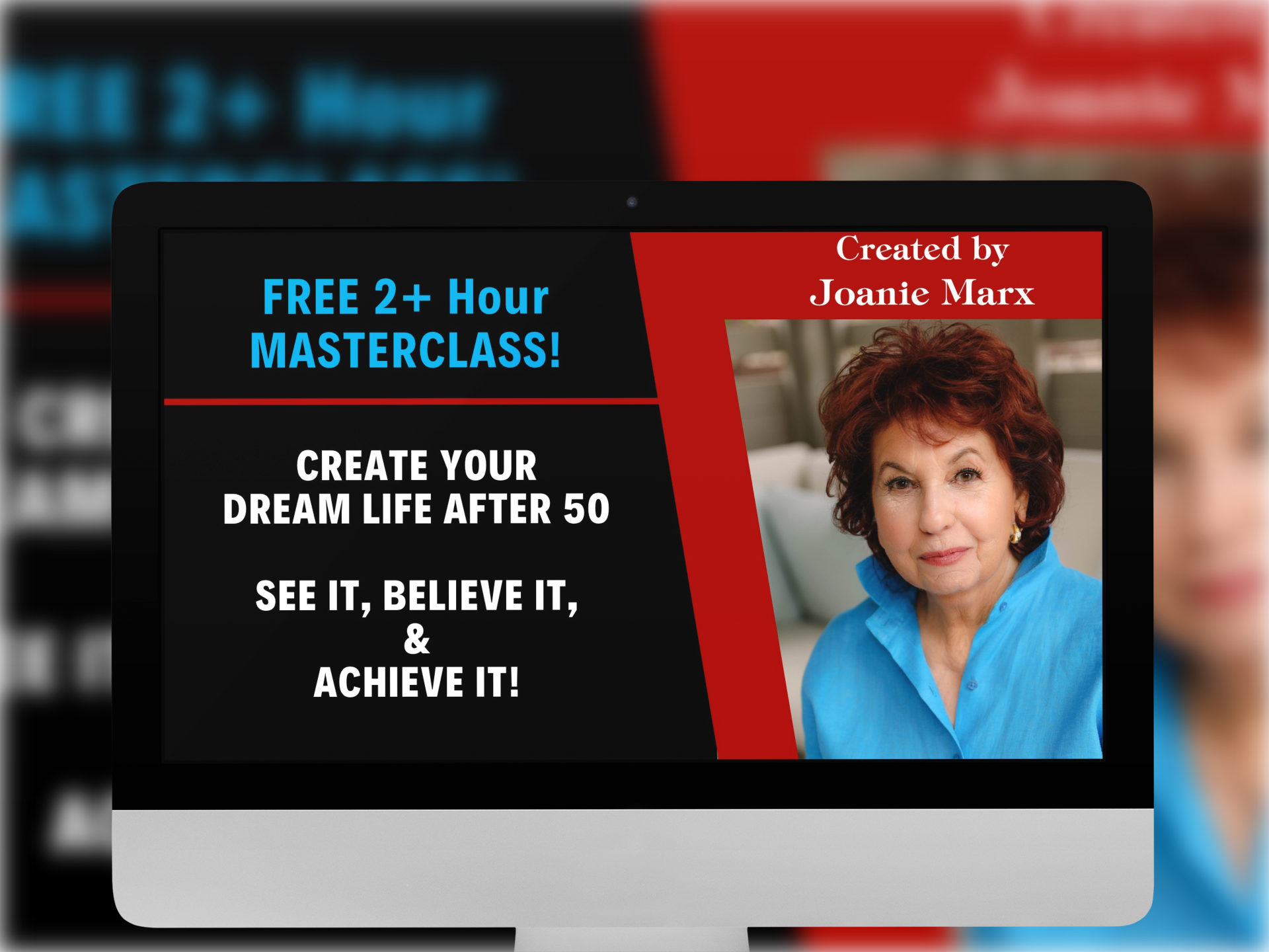 Based on Joanie Marx’s three new, acclaimed online courses, and designed around her proven "See It, Believe It & Achieve It" framework, this groundbreaking masterclass is created for women and men over 50 who want to break free of society's limiting beliefs about aging and create their ideal, dream lifestyle.