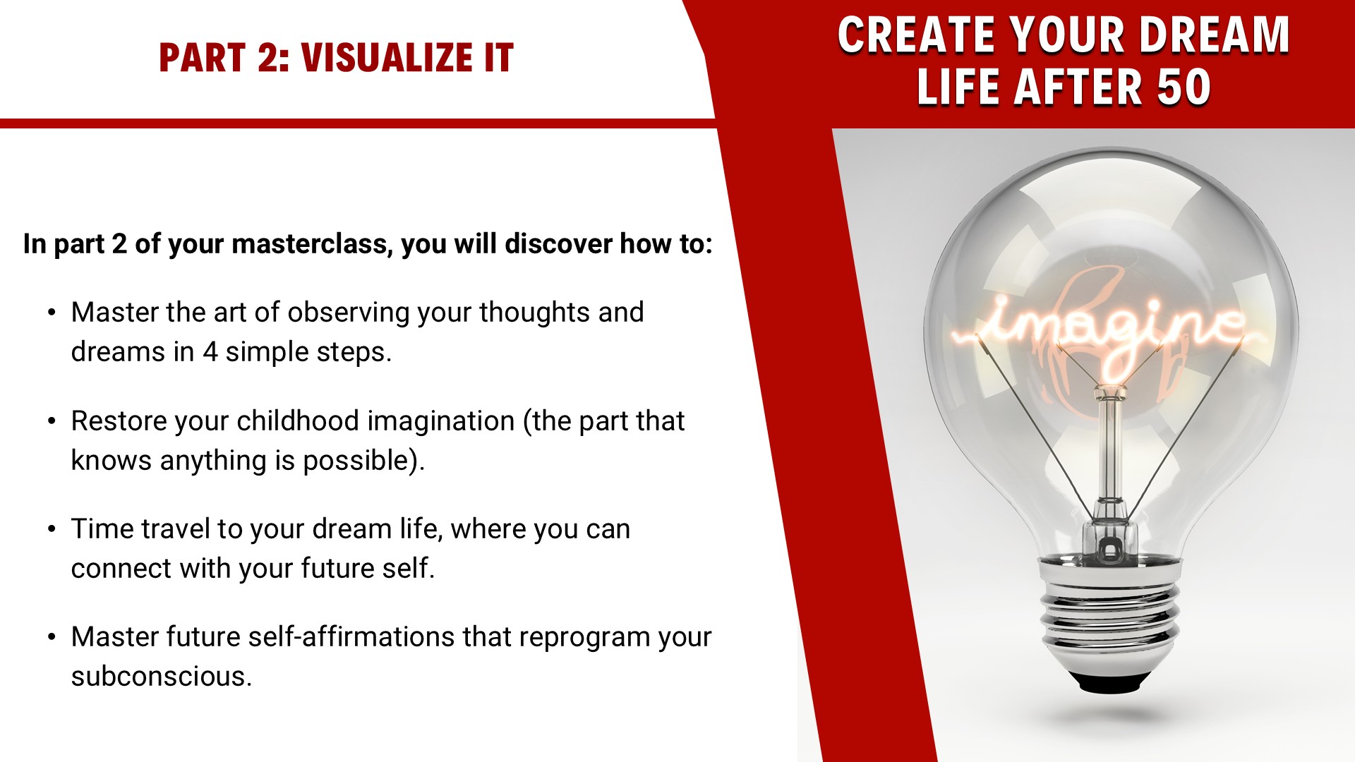 This is not your average free webinar or another overpriced and underwhelming masterclass. With real-life examples, you will be shown how to utilize evidence-based visualization techniques and proven steps to reimagine your life through new, empowering beliefs.