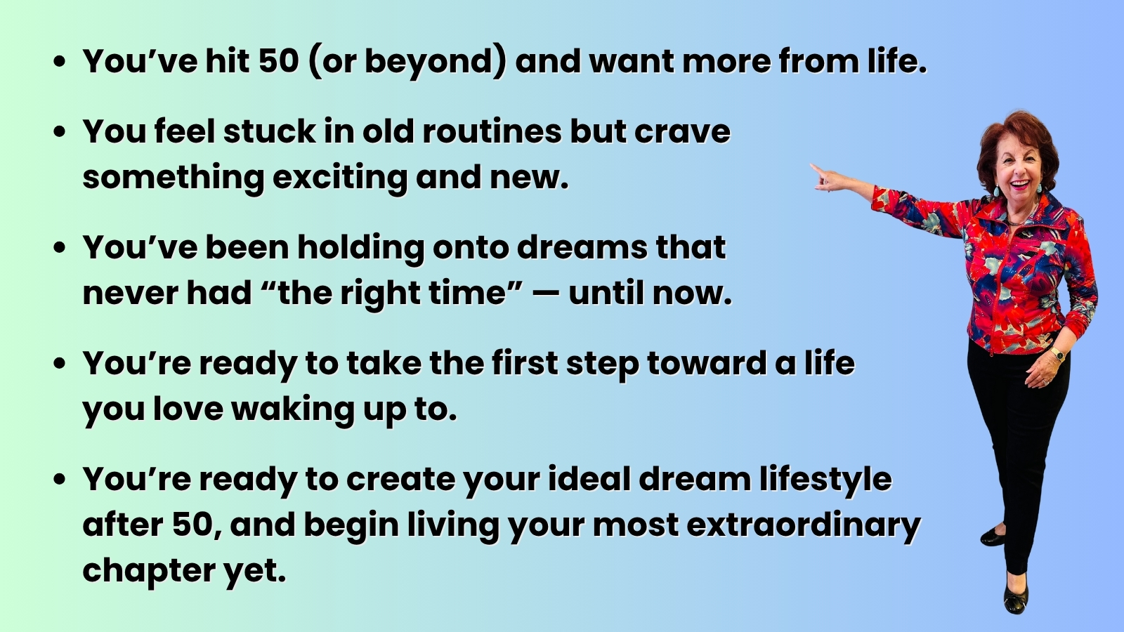 A leading authority on rewriting the rules of aging, she offers her first-ever free masterclass, delivering an easy-to-follow inner roadmap and a vivid mental blueprint to create your dream life in your 50s, 60s, 70s, and beyond.