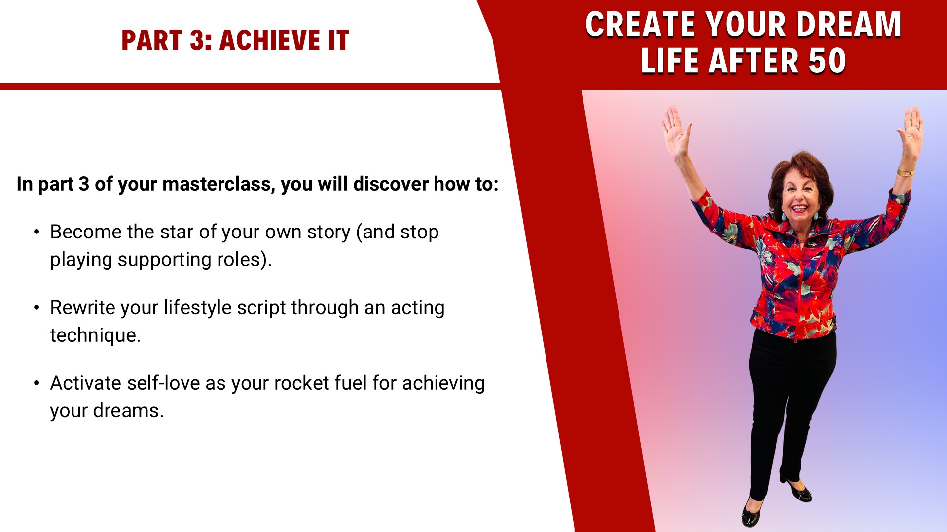 My "See It, Believe It & Achieve It" framework is the foundation for what you will discover in the masterclass. I developed and personally used this framework to fulfill my life-long dream of becoming a full-time character actress in Hollywood in my 40s and 50s and become a 3-time international bestselling author in my 60s.