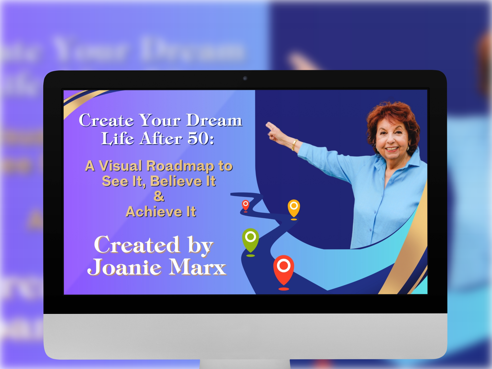 In this groundbreaking new online course by 3-time bestselling author & Storytelling Magician™, Joanie Marx, you will discover how to apply her “See It, Believe It & Achieve It” framework to visualize your dreams in vivid detail and actualize them into a new, vibrant lifestyle in your 50s, 60s, 70s, or beyond.