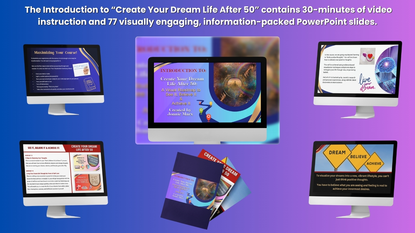 These mini-course modules reveal intimate details of Joanie Marx's remarkable journey from her 50s to her present-day 70s, showing you practical lifestyle tips and guidance for how to apply her "See It, Believe It & Achieve It" framework to your own life.