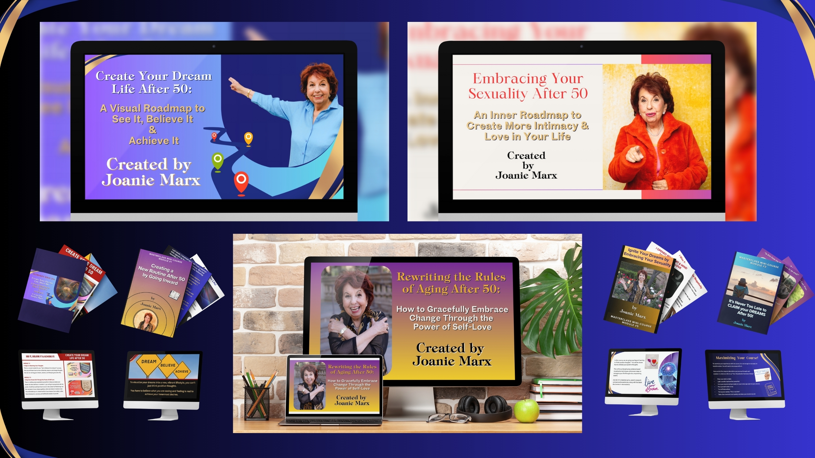 Designed around Joanie's proven "See It, Believe It & Achieve It" framework, her acclaimed courses are created for women and men over 50 to boldly step into their most vibrant, creative, and fulfilling chapter of life with clarity, confidence, and joy.