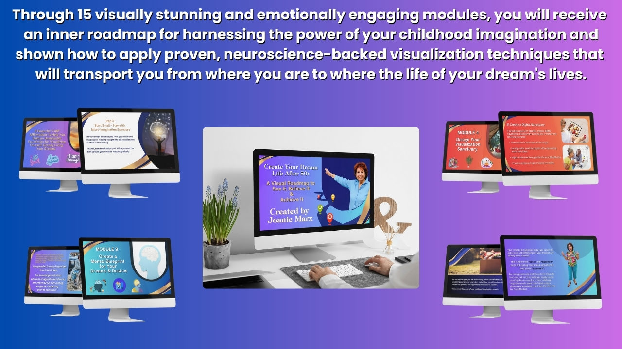 Through 15 visually stunning and emotionally engaging modules, you will receive an inner roadmap for harnessing the power of your childhood imagination and using proven, neuroscience-backed visualization techniques to transform your life in your 50s, 60s, 70s, and beyond.
