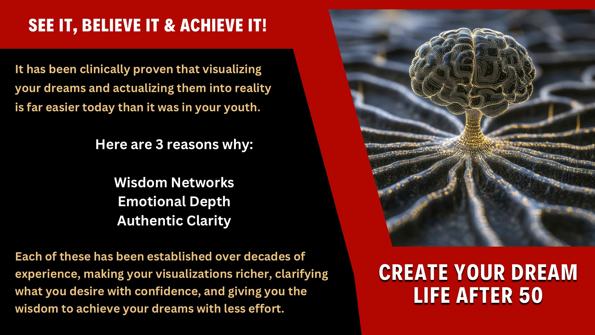 The course introduction also touches on several neuroscience studies that have all proven that your brain after 50 is perfectly wired for transforming your dreams and desires into a vibrant lifestyle.