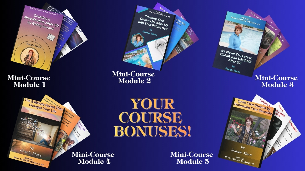 These mini-course modules reveal intimate details of Joanie Marx's remarkable journey from her 50s to her present-day 70s, showing you practical lifestyle tips and guidance for how to apply her "See It, Believe It & Achieve It" framework to your own life.