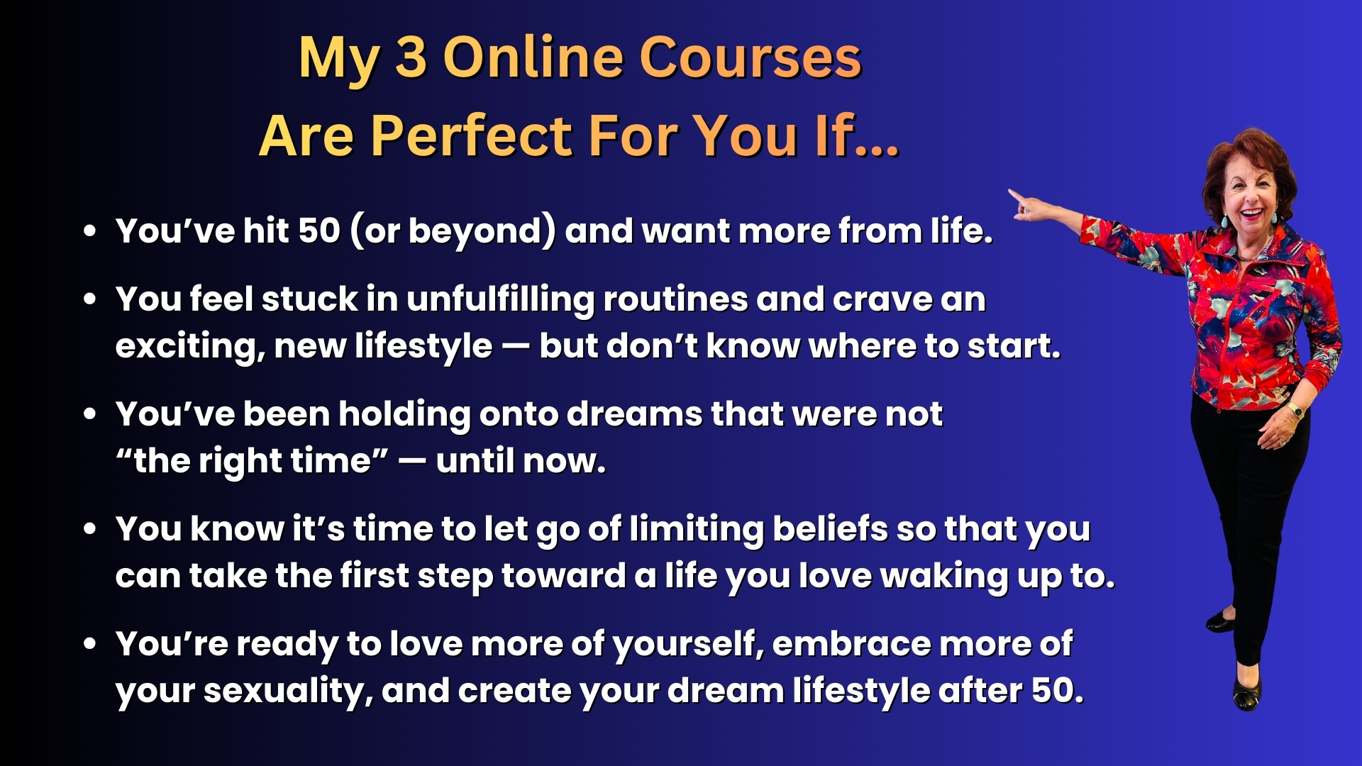 With 300 visually stunning, information-packed PowerPoint slides (available as a downloadable PDF), each segment of your masterclass will contain personal, real-life stories from me that will demonstrate how I rewrote the rules of aging, embraced more of my sexuality, and created the life of my dreams in my 50s, 60s, and 70s.